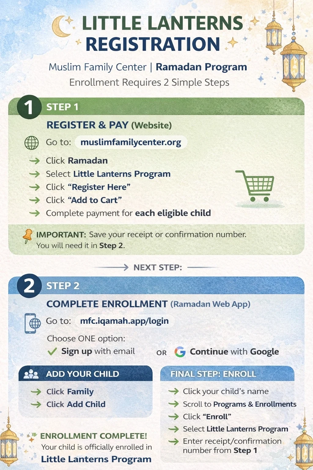 Little Lanterns is MFC’s Ramadan kids program created to give young children a joyful and meaningful experience while their parents pray. It provides a safe, welcoming space where children are supervised with care and guided through age-appropriate activities rooted in Islamic values.